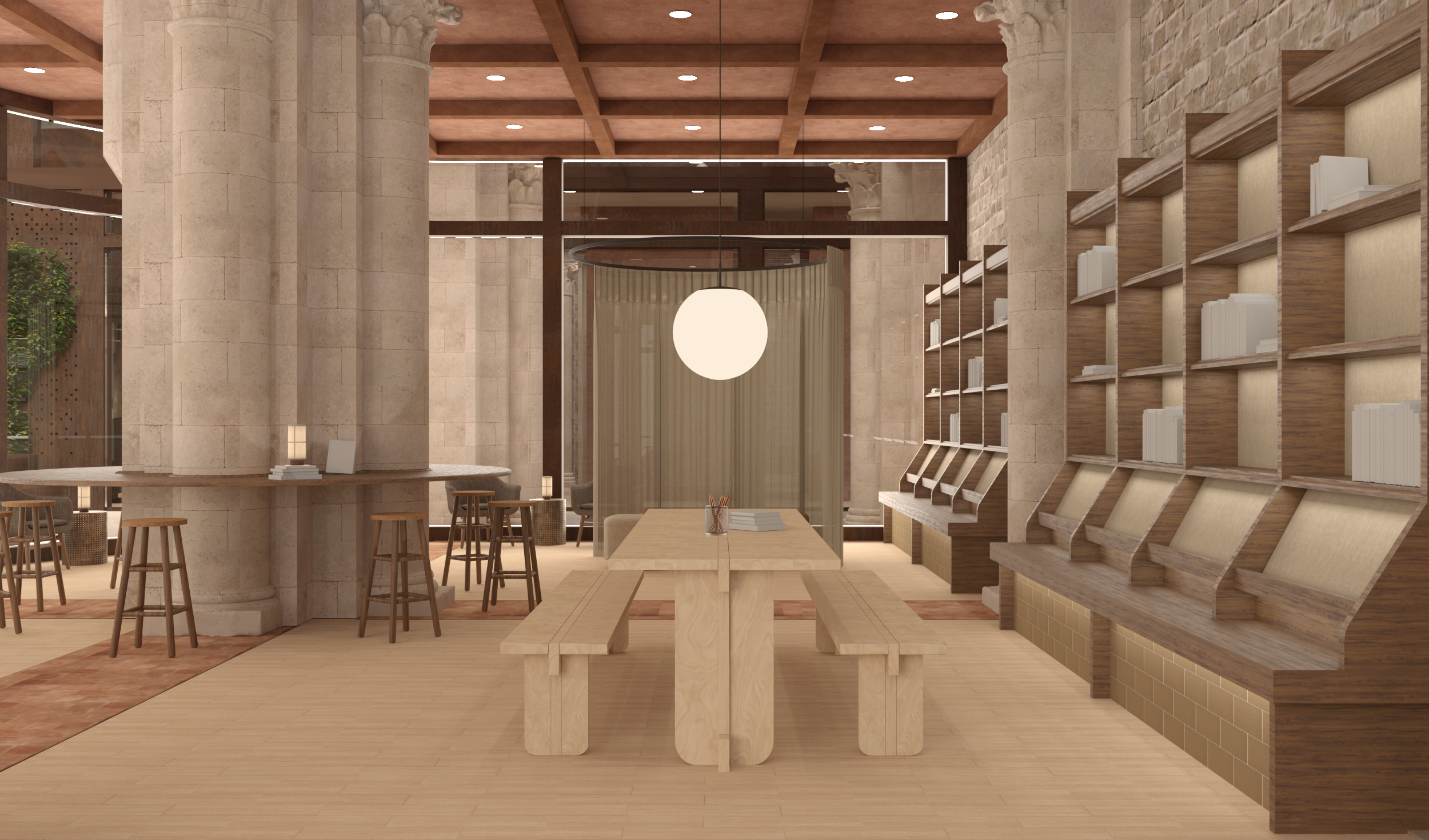 The library serves as a common space for reading, studying or informal meetings. With a modular furniture structure, the space can also function as a space for guest lectures and events. A flexible environment that suits both individuals and collective learning. A space designed for learning, connections and reflection.