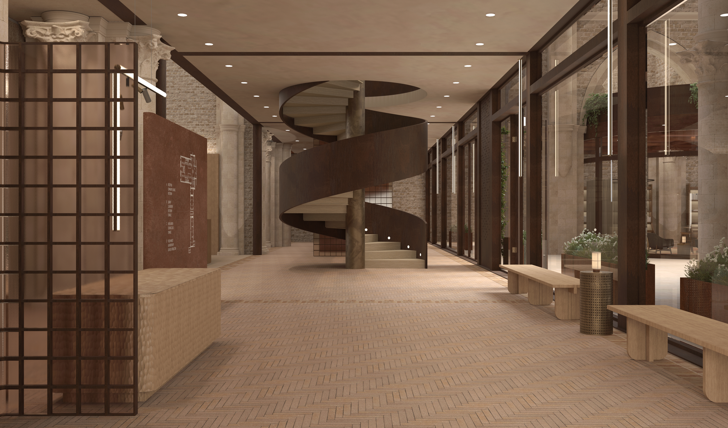 Warm tones combined with natural, tactile materials create a space that feels grounded and inviting. The spiral staircase in corten creates a focal point and depth, with a rhythmic spatial flow from the windows out to the abbey’s courtyard.