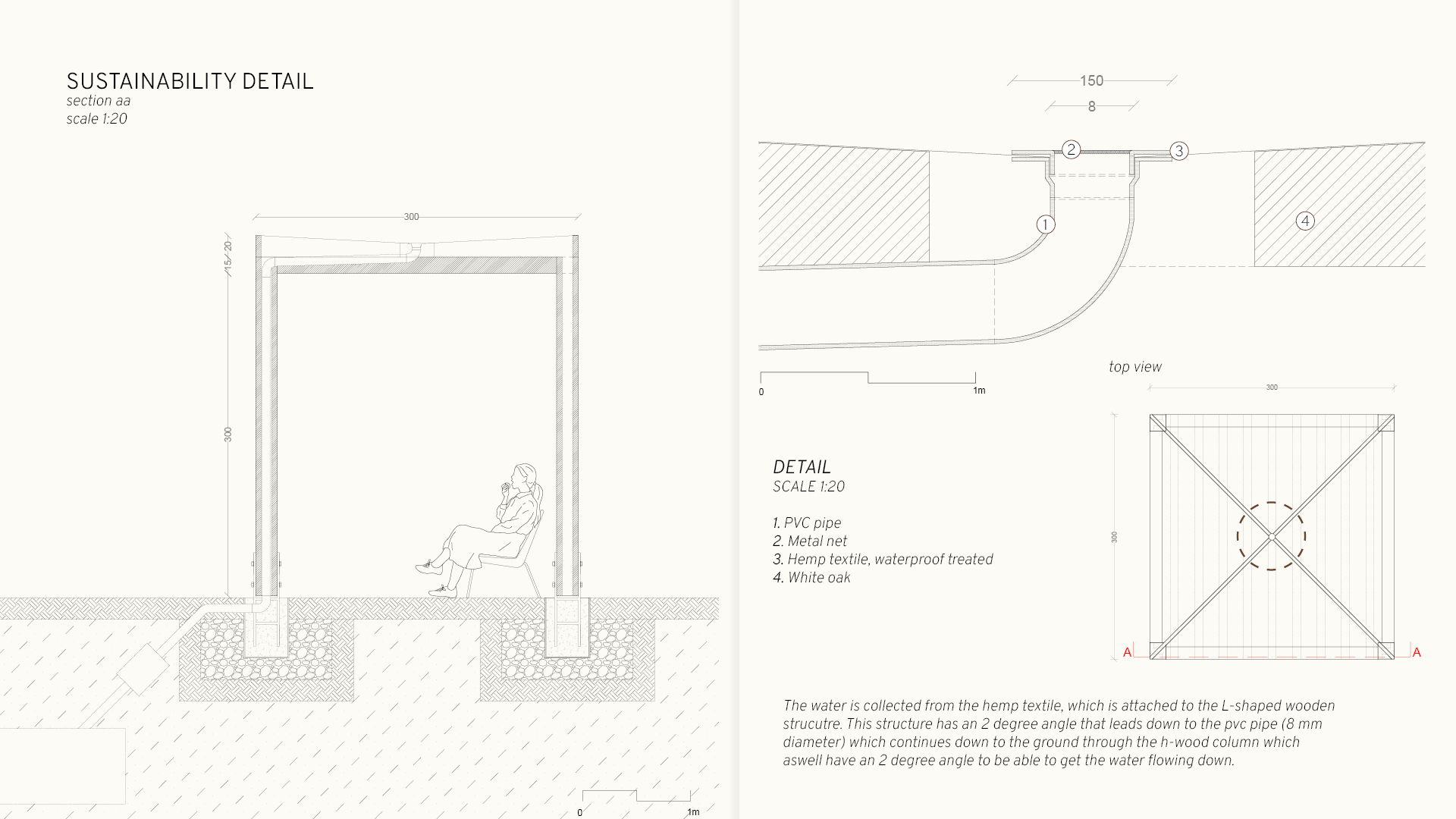 The pergola is designed to collect and redirect rainwater on-site, supporting a self-sufficient water cycle and strengthening the project’s connection to the surrounding landscape.